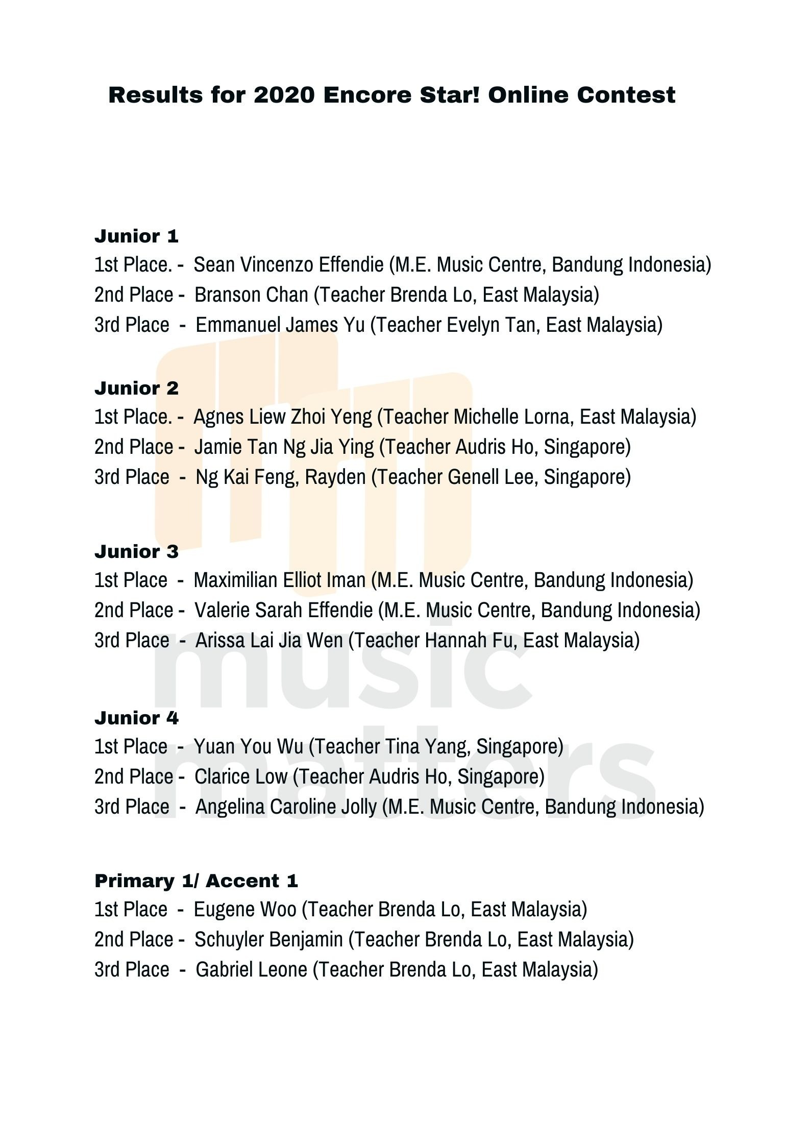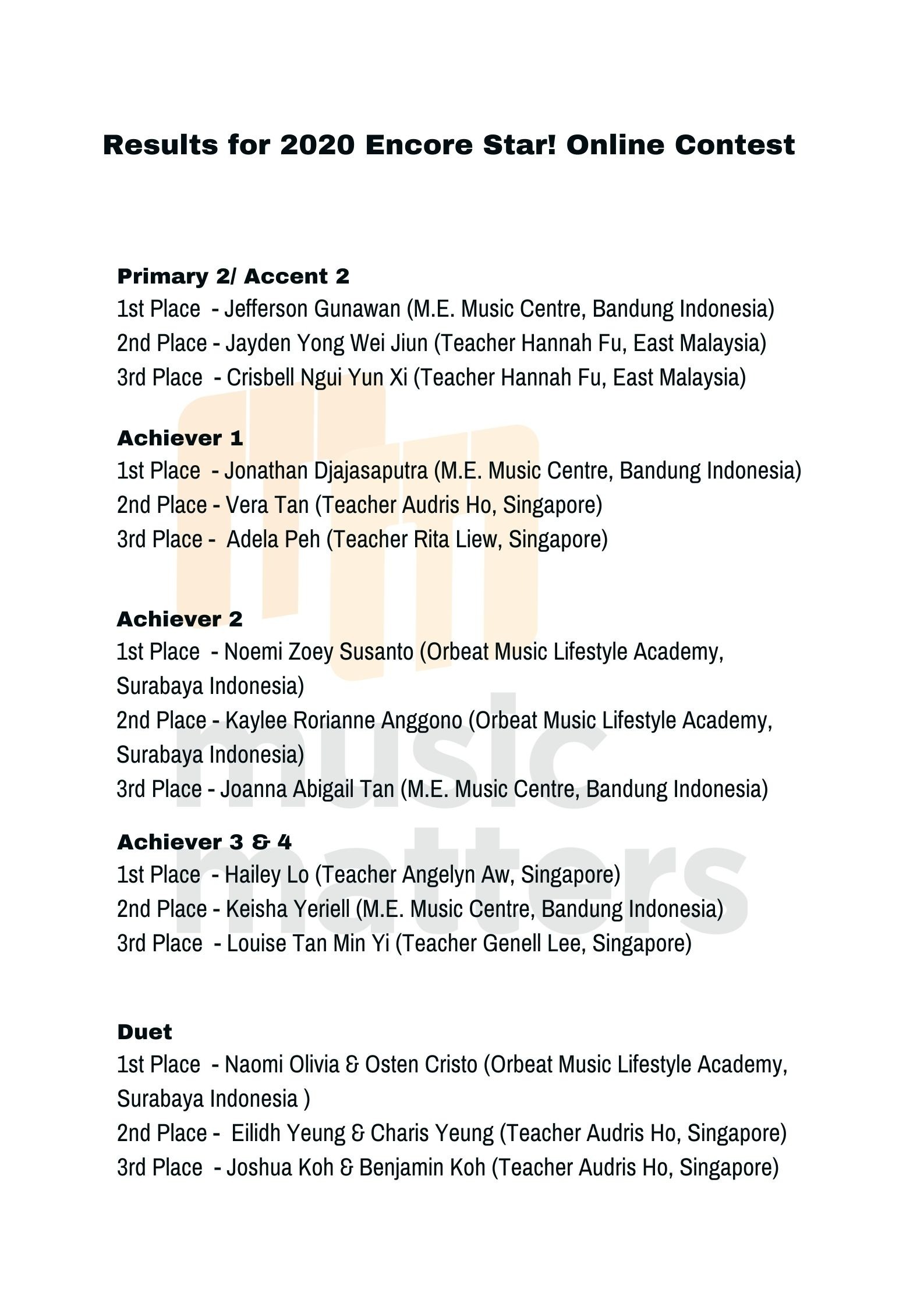 This contest is open to every teacher in Singapore, Malaysia and Indonesia who has and is using the Encore syllabus in their teaching. For teachers who are new to this program, you may get started by contacting us for more details. If you are a parent whose child has used the Encore books, but is no longer with the teacher who introduced this program to you, you may also submit your child's video directly to us.